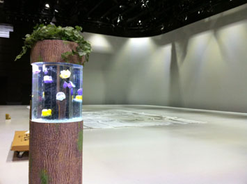 毎日放送の新らしくできたスタジオに水槽の移動再設置に来ました。まだ何もセットの入っていない新品のスタジオに水槽が一番乗り。 壁と床との間のスペースが結構深い断崖になっていて、近寄るのも怖いくらいです。天井が高くて水槽がとても小さく見えます。