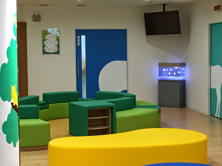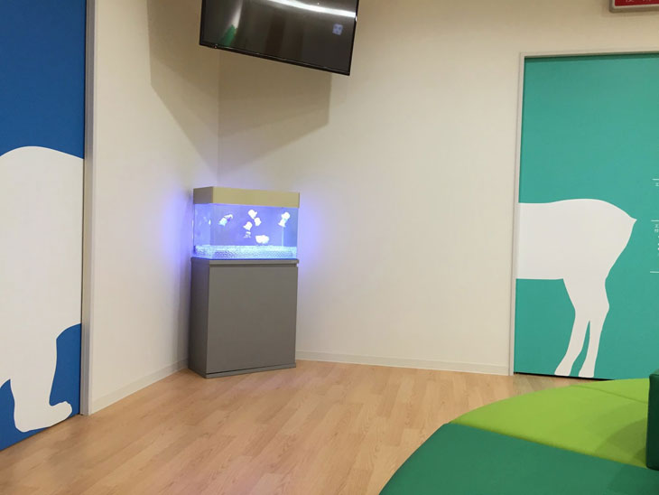 こどもの専門病院の新築でL60型水槽を移転させてもらいました。 ソファーも壁も青、黄、緑と楽しい色づかいで、動物たちも隠れています。 水槽の方も、色の入ったクラゲをメンテナンスのたびに入れ替えさせてもらっています。