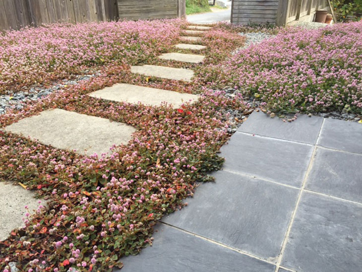 工房の玄関周りに植えたわけでもないのに、はびこってくる植物があります。 石畳も侵食しそうな勢いですが、ピンクの小さな花が咲くとなかなか美しいです。