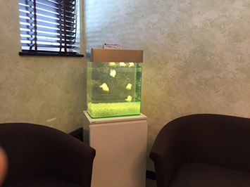 遠方のレンタル水槽のときは、その後のメンテナンスをお願いする地元のクリーニング業者さんと設置作業をします。